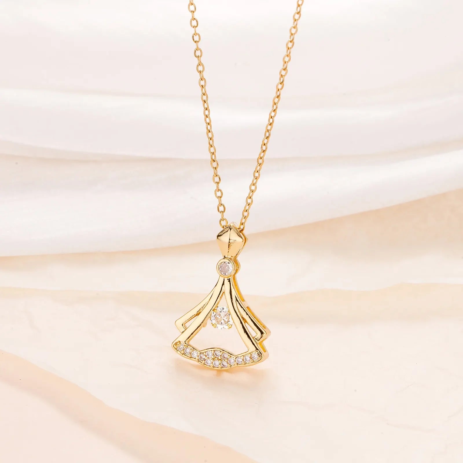 Our 24K Gold Plated Fan Necklace is crafted for elegance and charm. With a unique fan-shaped pendant and a luxurious 24K gold plating, this piece is designed to make any outfit shine.