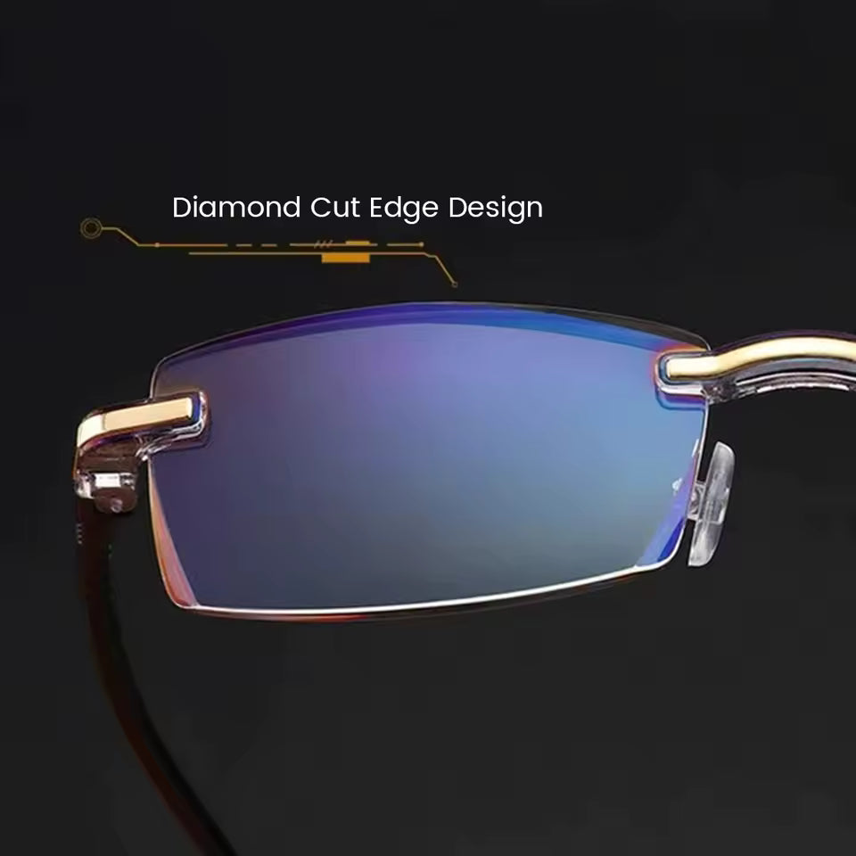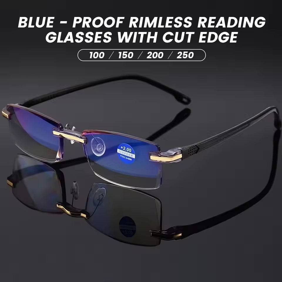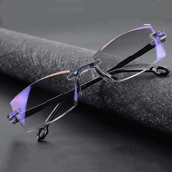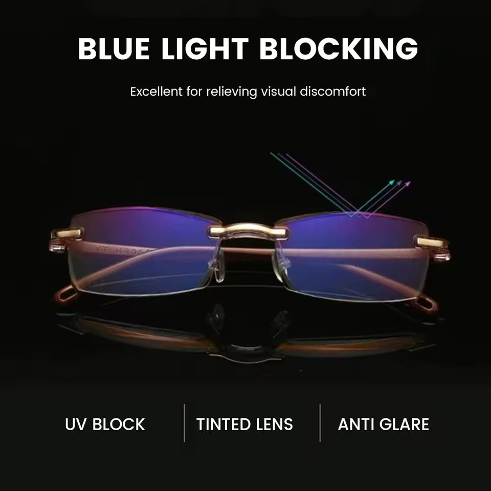 - ✨【Glittering Sapphire High Hardness Progressive Anti-Blue Light Reading Glasses】: Classic rimless frame design, ultra-light, no pressure on your face and ears, durable, strong frame.reflects and absorbs harmful blue light, blocks visible harmful high-energy blue light.